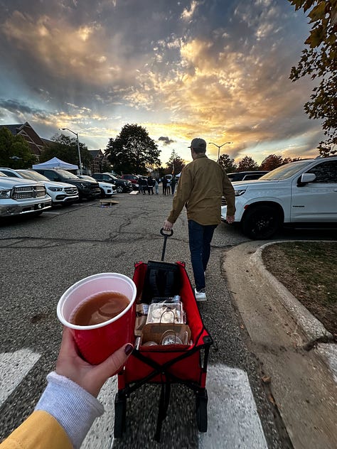 Good food is a necessity for those late-season outdoor events. I went tailgating last weekend - the best part was, of course, bopping around with fun people. But the good food was a close second! We followed the time-honored American football tradition of filling our bellies with as many snacks and drinks as possible. Apple cider was sipped. Pumpkin cookies were shared. An entire wagon of food was wheeled through crowds of undergrads who may or may not have overindulged in alcoholic beverages.